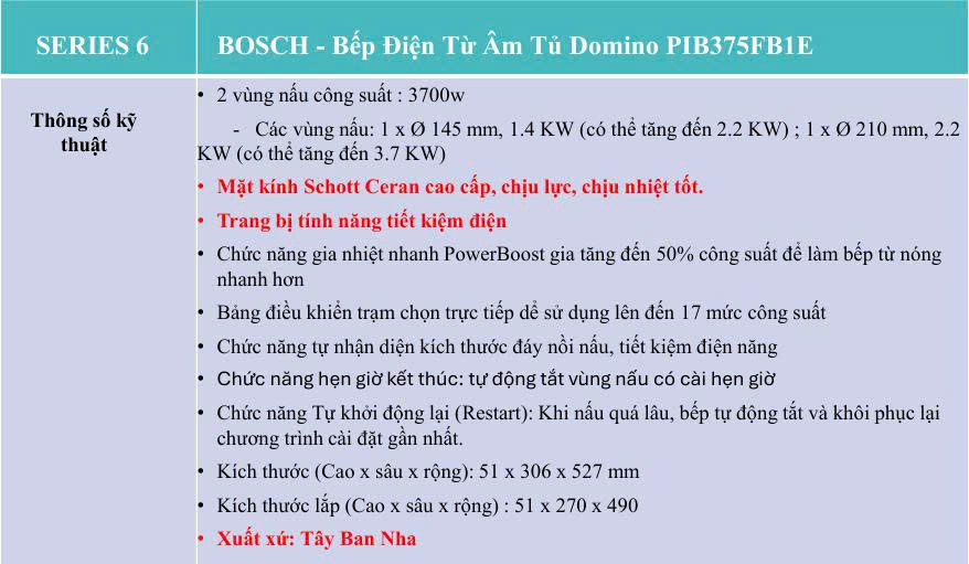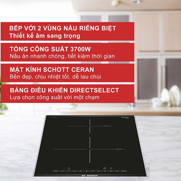 Bếp từ Bosch PIB375FB1E ngoài 2 vùng nấu ra, bếp còn rất nhiều tính năng khác vừa giúp bạn tiết kiệm thời gian nấu. Đồng thời còn thiết kế cực bắt mắt và sang trọng. Còn chần chừ gì nữa, hãy gọi ngay cho chúng tôi và đặt hàng trải nghiệm nhé.