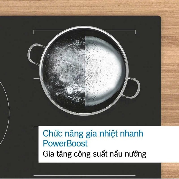 - Bếp điện từ Bosch với tổng công suất 3500W khi bật 2 bếp cùng lúc cho phép bếp từ hoạt động mạnh mẽ.