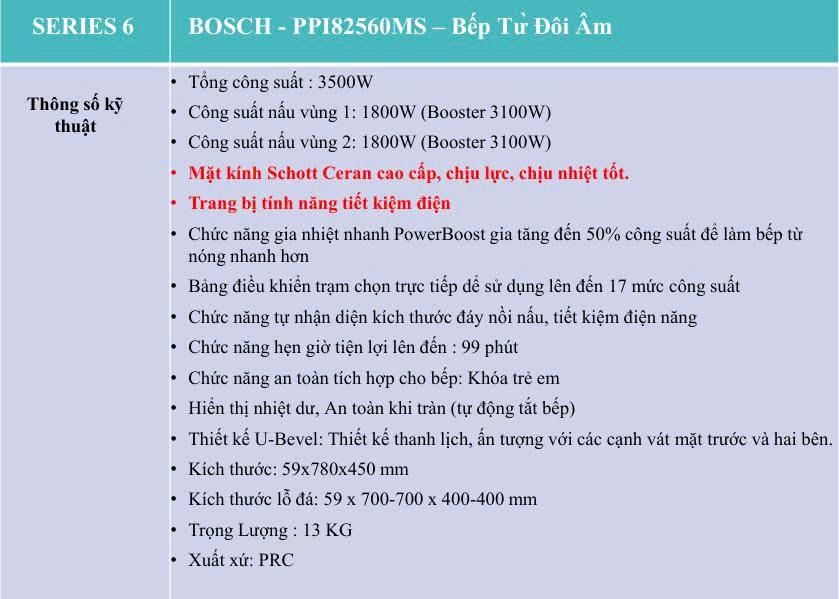 Công suất - Bếp từ đôi lắp âm Bosch PPI82560MS