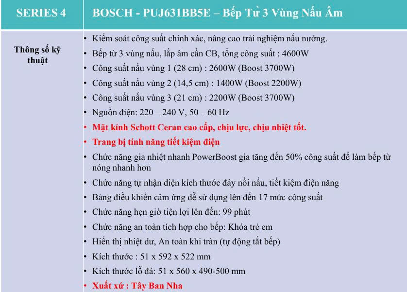 Với tất cả các tính năng nổi bật như thiết kế sang trọng, công suất mạnh mẽ và tính năng thông minh, bếp từ Bosch PUJ631BB5E Serie 4 là lựa chọn lý tưởng cho không gian bếp hiện đại của bạn.