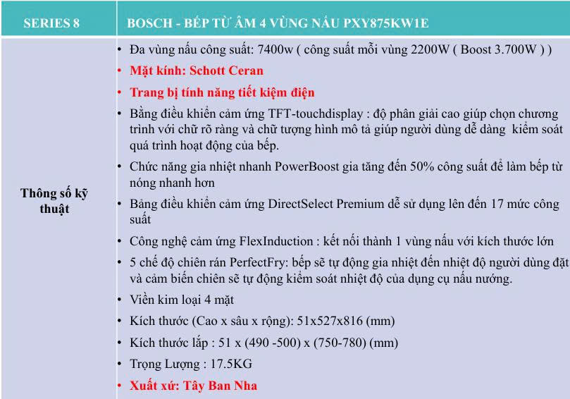 Bếp từ Bosch PXY875KW1E Serie 8 là sự lựa chọn hoàn hảo cho những gia đình yêu thích nấu nướng và tìm kiếm một thiết bị nhà bếp thông minh, tiện lợi. Với các tính năng hiện đại như FlexInduction, Home Connect, PowerBoost, và PerfectFry, sản phẩm này không chỉ giúp tiết kiệm thời gian mà còn mang lại trải nghiệm nấu ăn tuyệt vời.