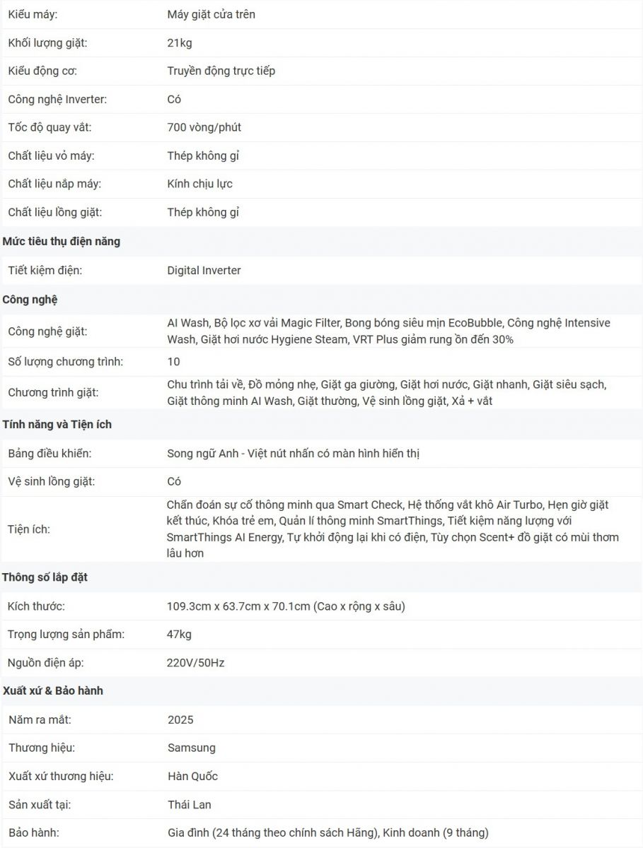 Máy giặt Samsung Inverter 21kg AI Wash WA80F21B9BSV là sự lựa chọn hoàn hảo cho các gia đình đông thành viên nhờ vào công nghệ giặt tiên tiến và thiết kế mạnh mẽ. Từ công nghệ EcoBubble giúp giặt sạch sâu, tính năng giặt thông minh AI Wash, đến động cơ Digital Inverter tiết kiệm điện và giặt hơi nước Hygiene Steam diệt khuẩn, máy giặt này không chỉ giúp bạn tiết kiệm thời gian và năng lượng mà còn bảo vệ sức khỏe cho cả gia đình. Sự kết hợp giữa hiệu suất vượt trội và thiết kế hiện đại khiến đây trở thành một sự đầu tư đáng giá cho mọi gia đình.