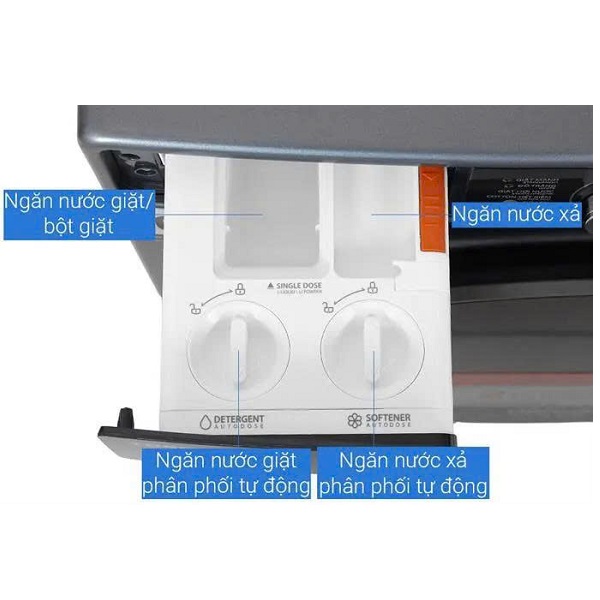 Công nghệ SenseDose tự động phân bổ nước giặt xả là tính năng rất thực tế: máy dùng cảm biến để ước lượng lượng đồ và chương trình, sau đó tự lấy lượng nước giặt, nước xả phù hợp, giúp hạn chế dư chất giặt tẩy bám lại trên vải, đồng thời tránh lãng phí hóa chất sau mỗi mẻ giặt.
