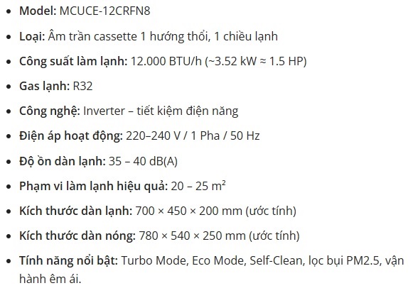 Nếu bạn đang tìm kiếm một chiếc máy lạnh âm trần Midea MCUCE-12CRFN8 có thiết kế nhỏ gọn, hoạt động êm ái và tiết kiệm điện, thì đây chính là model đáng cân nhắc nhất trong năm 2026.