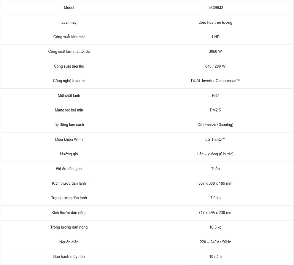 Với công suất làm mát tối đa 3050W, LG IEC09M2 đáp ứng hiệu quả nhu cầu làm lạnh cho phòng: