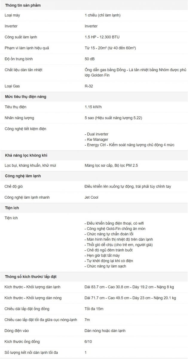 Công suất 1.5HP sẽ phù hợp với không gian từ 15m2 - 20m2, giúp làm lạnh hiệu quả.
