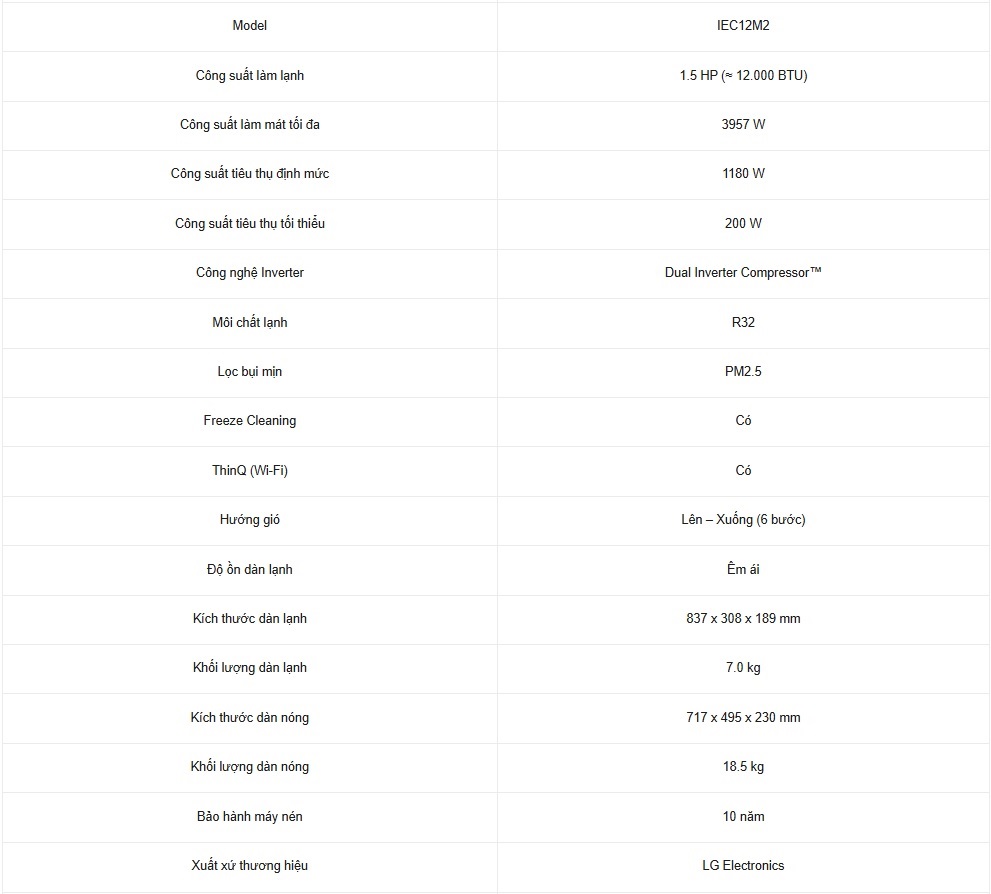 Máy lạnh LG Inverter 1.5 HP IEC12M2 là lựa chọn lý tưởng cho người dùng đang tìm kiếm một thiết bị điều hòa làm lạnh nhanh – tiết kiệm điện – vận hành êm – không khí sạch, phù hợp cho phòng ngủ, phòng khách, phòng làm việc diện tích từ 15–20m². Sản phẩm hội tụ công nghệ Dual Inverter Compressor™, Freeze Cleaning, lọc bụi mịn PM2.5, quản lý điện năng chủ động kW Manager và hệ sinh thái LG ThinQ™ thông minh.