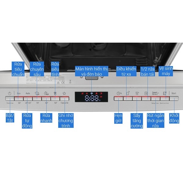 – Điều khiển bằng điện thoại qua ứng dụng Home Connect: Sau khi cài đặt ứng dụng Home Connect trên điện thoại, bạn có thể điều khiển từ xa các chức năng máy. Thậm chí, ứng dụng còn đề xuất cho bạn chương trình rửa phù hợp để tối ưu hóa chu trình rửa bát, đồng thời cho phép bạn theo dõi và kiểm soát điện năng tiêu thụ của máy.