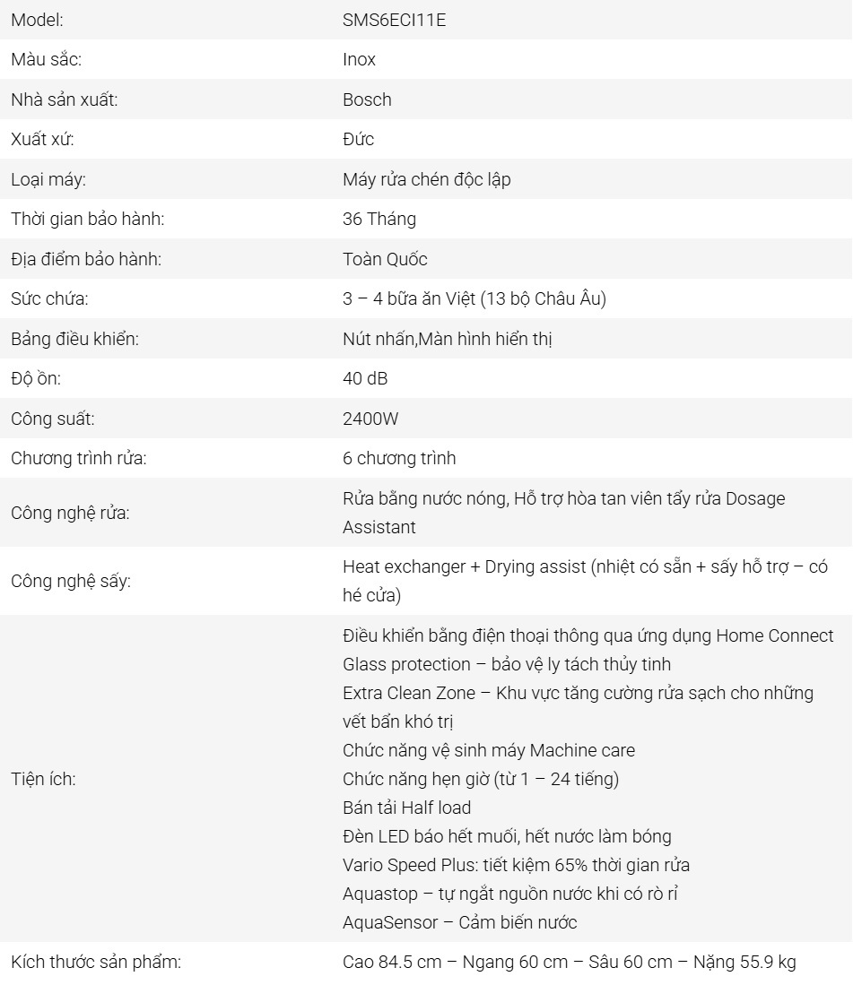 Nhìn chung, máy rửa chén độc lập Bosch SMS6ECI11E có thể điều khiển từ xa bằng ứng dụng tiện lợi, cho khả năng làm sạch chén bát và khử mùi hôi vượt trội nên tiết kiệm thời gian rửa chén bát cho các hộ gia đình có cuộc sống bận rộn, hiện đại ngày nay.