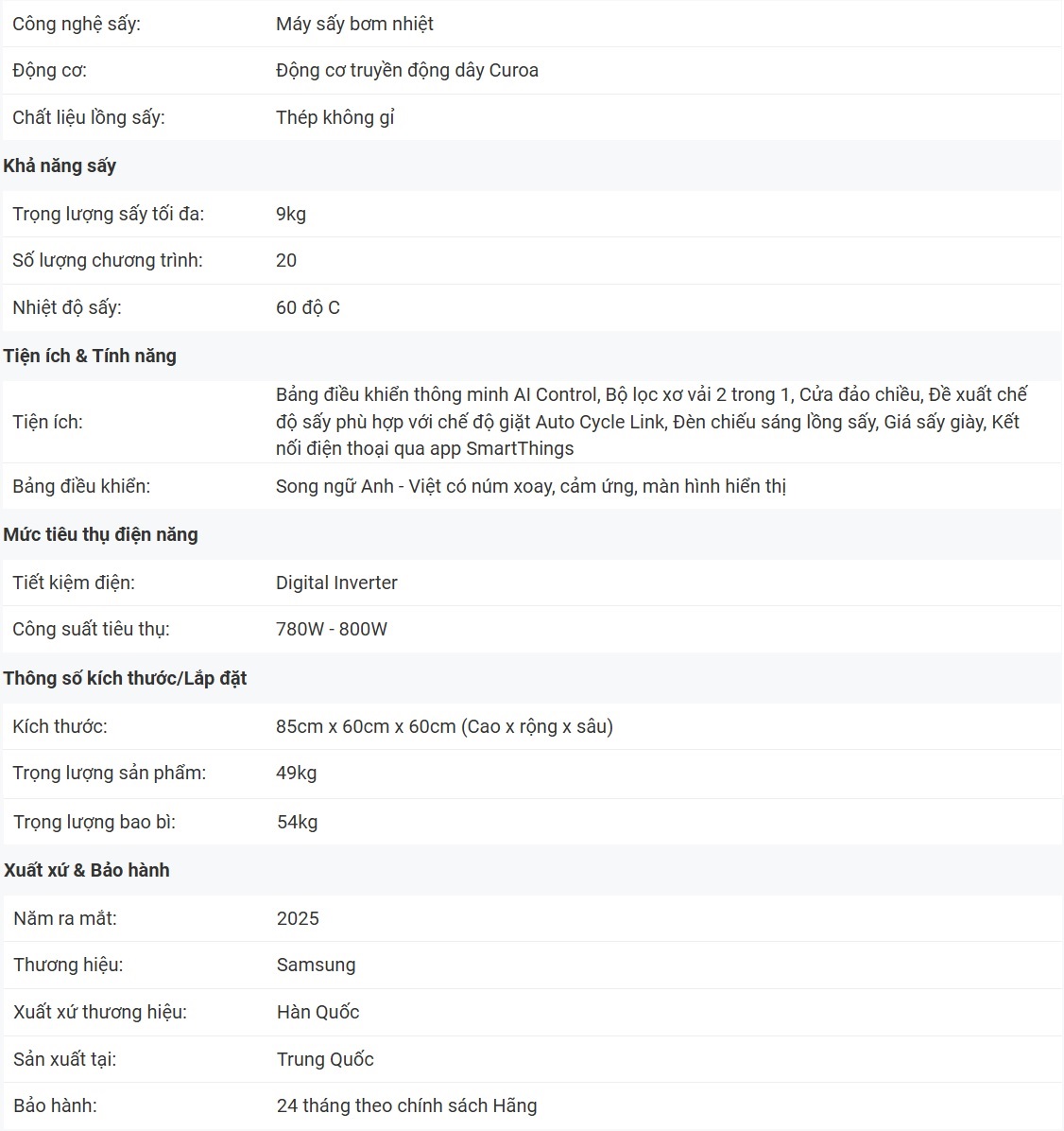 Khối lượng sấy 9kg phù hợp cho gia đình từ 3 - 5 thành viên.