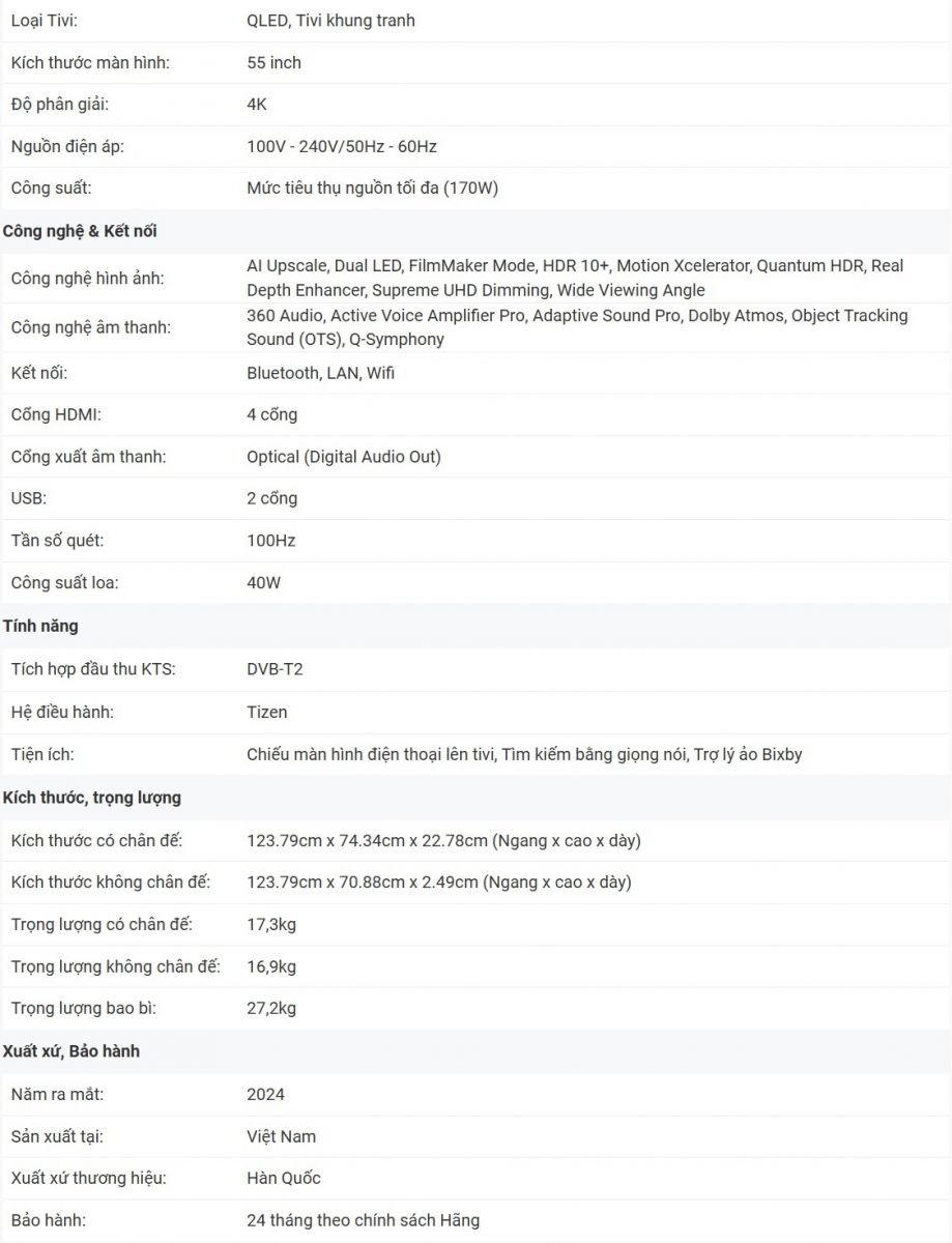 Giống như một kiệt tác nghệ thuật, đồng thời được trang bị nhiều công nghệ, tiện ích thông minh, Smart tivi khung tranh 4K QLED 55 inch Samsung The Frame QA55LS03DAKXXV chắc chắn sẽ là một điểm nhấn nổi bật cho bất cứ không gian sống nào. Đừng bỏ qua model này nếu bạn muốn sở hữu một chiếc tivi độc đáo cho không gian sống hiện đại của gia đình mình nhé.