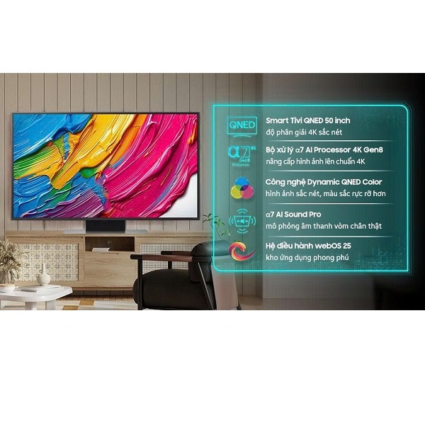 Smart Tivi QNED LG AI 4K 50 inch 50QNED81ASA sở hữu màn hình 50 inch, độ phân giải 4K cùng công nghệ Dynamic QNED Color. Đây là model hướng đến gia đình nhỏ hoặc phòng ngủ lớn, đáp ứng tốt nhu cầu giải trí với hình ảnh sắc nét và màu sắc sinh động.