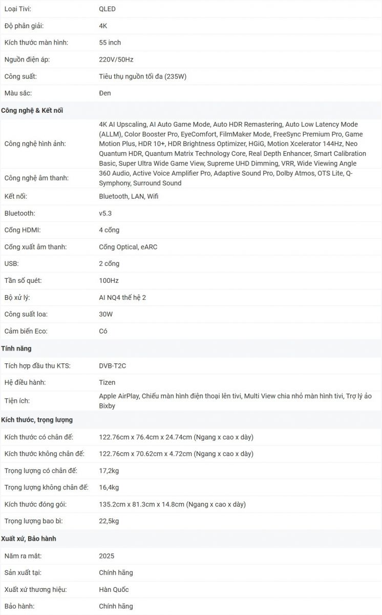 Smart tivi Samsung Neo QLED 4K 55 inch QA55QN80FAKXXV Vision AI là model tivi cao cấp, được Samsung ra mắt thị trường hồi đầu năm 2025. Với thiết kế Simple Chamfer siêu ấn tượng kết hợp hàng loạt công nghệ âm thanh, hình ảnh tiên tiến, cùng nhiều thuật toán AI hiện đại, thông minh chắc chắn sẽ nâng cấp trải nghiệm giải trí cho bạn và các thành viên trong gia đình lên một tầm cao mới.