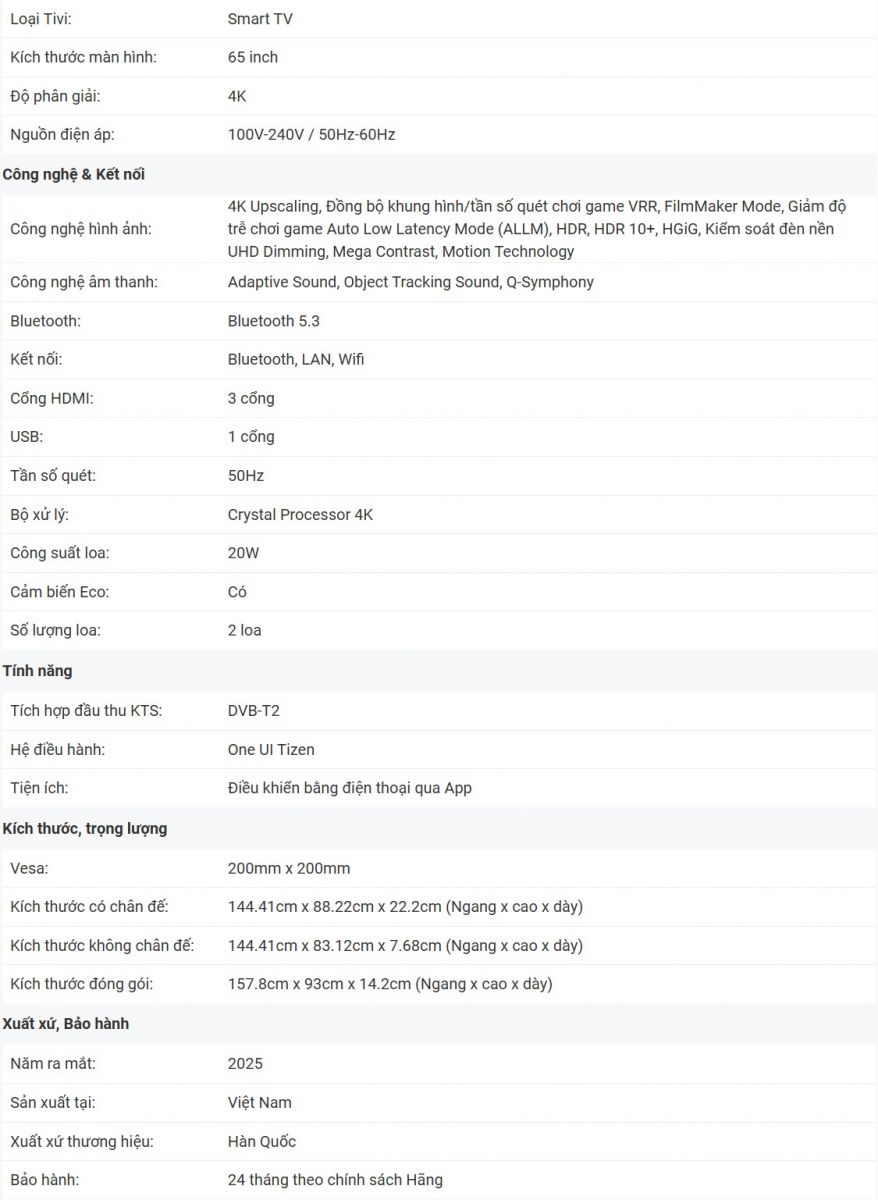 Tivi sở hữu bộ xử lý Crystal 4K hiện đại, giúp nâng cấp nội dung có độ phân giải thấp lên gần chuẩn 4K, mang đến hình ảnh mượt mà và ít nhiễu hơn. Màn hình có độ phân giải 4K UHD với mật độ điểm ảnh gấp 4 lần Full HD, đảm bảo hiển thị chi tiết, sắc nét trong từng khung hình. Kết hợp cùng công nghệ PurColor, màu sắc được tái hiện rực rỡ, sống động, cho trải nghiệm xem chân thực như ngoài đời.