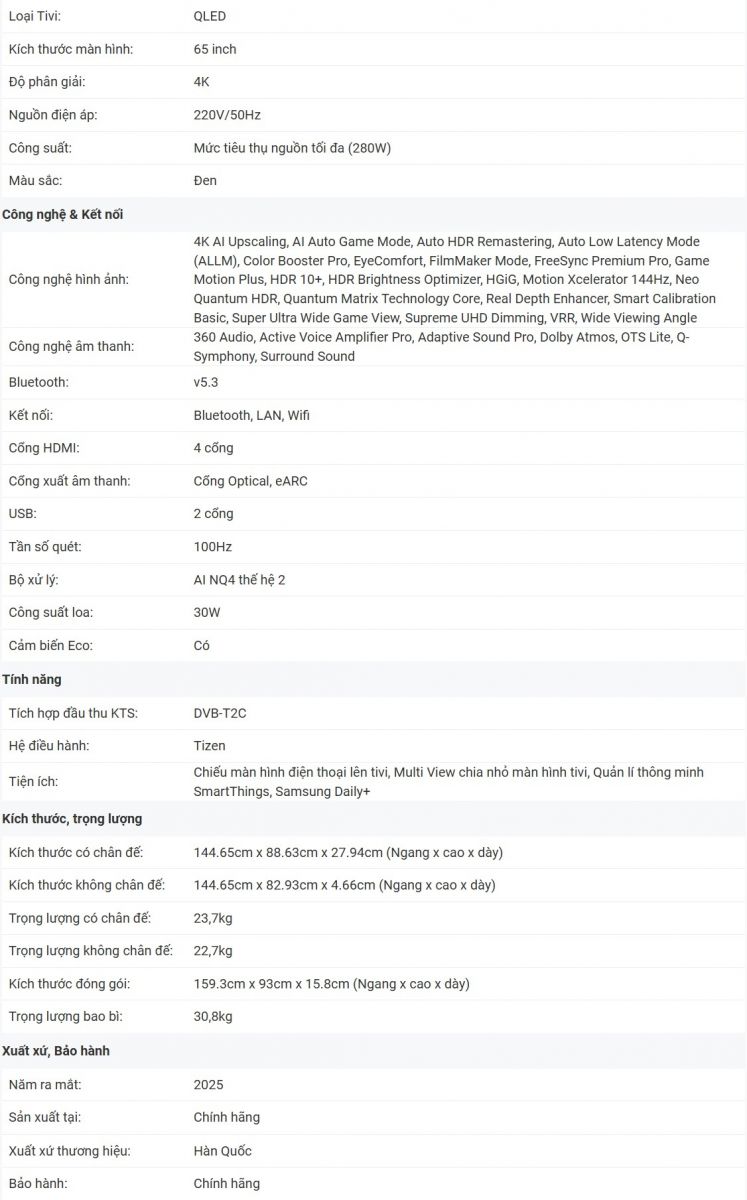 Kích thước màn hình là 65 inch, phù hợp cho nhiều không gian rộng rãi.