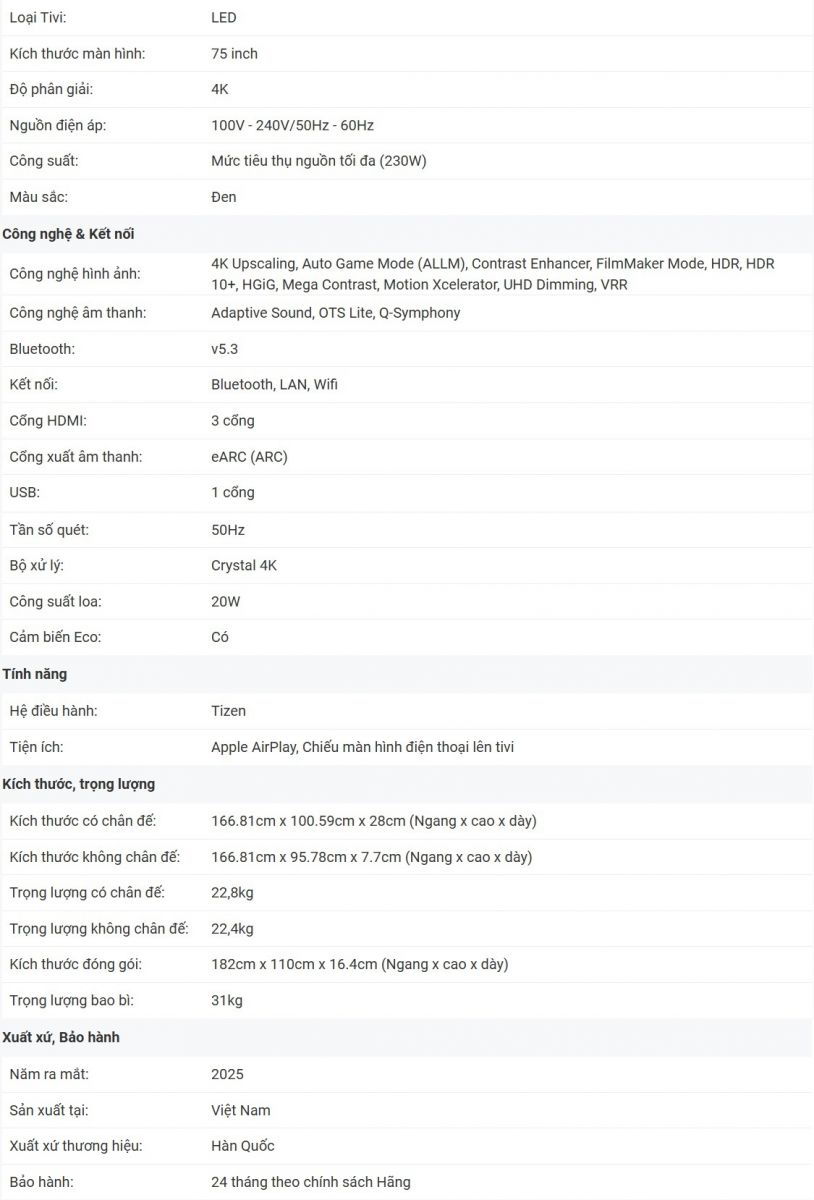 Ngoài phiên bản 70 inch - Samsung UA70U8000FKXXV, Samsung còn tiếp tục cho ra mẫu smart tivi Samsung 4K Crystal UHD UA75U8000FKXXV trong năm 2025. Sản phẩm sở hữu kích thước màn hình lớn tới 75 inch cho bạn trải nghiệm xem "đã mắt", là lựa chọn tuyệt vời cho những căn phòng rộng ở gia đình, cơ quan, trường học... Hãy cùng META khám phá chi tiết sản phẩm này nhé!