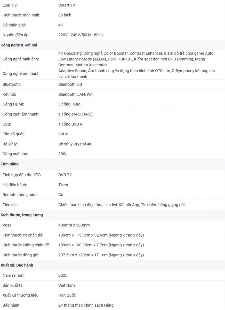 Với màn hình 85 inch 4K sắc nét, thiết kế kim loại MetalStream sang trọng, âm thanh sống động và hệ điều hành One UI Tizen thông minh, Smart Tivi Samsung 4K 85 inch UA85U8500FKXXV là lựa chọn lý tưởng cho không gian giải trí hiện đại, đáp ứng trọn vẹn nhu cầu xem phim, chơi game và kết nối nhà thông minh của gia đình cao cấp.