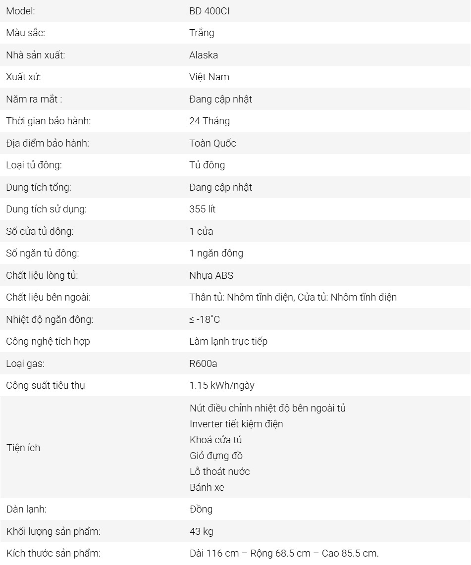 Tóm lại, Tủ Đông Alaska Inverter 355 lít BD 400CI thích hợp cho những hộ gia đình ít dưới người hoặc những ai kinh doanh thực phẩm thủy hải sản – kem, cửa hàng tạp hóa, quán ăn với quy mô nhỏ vì nhiệt độ làm lạnh thực phẩm sâu ≤ -18ºC.