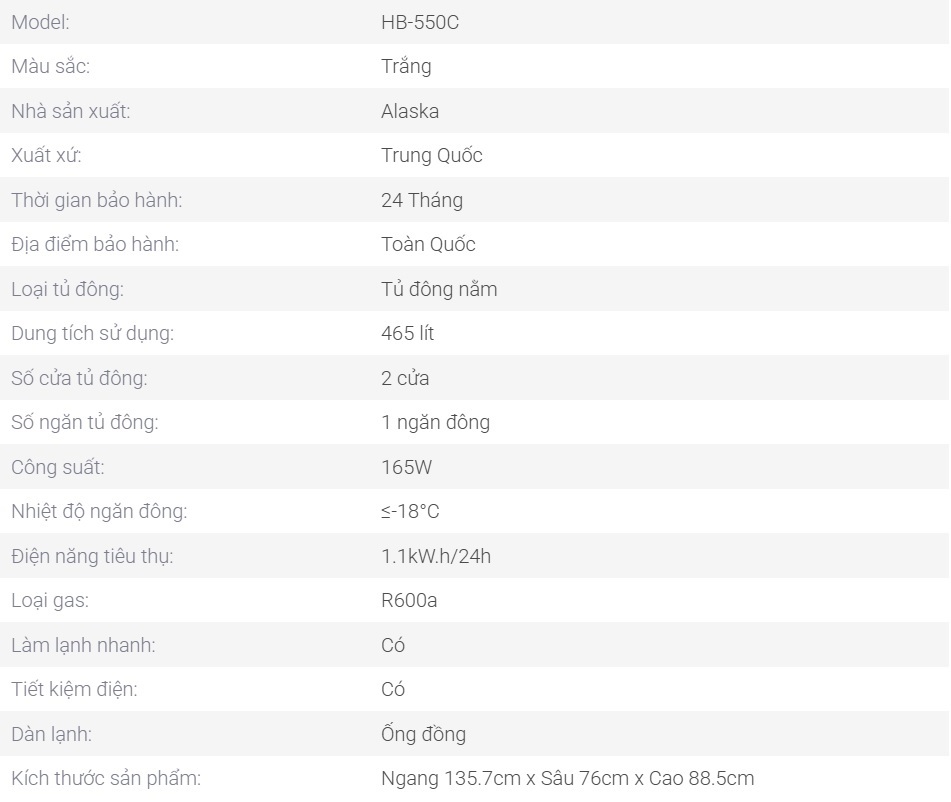 Tủ Đông Alaska 465 lít HB 550C được kế dàn lạnh bằng đồng bền bỉ tốt hơn so với các model dàn lạnh nhôm, lớp thành tủ dày, có zoăng bao quanh kín vì vậy có khả năng giữ lạnh cao, tiết kiệm điện năng sử dụng, nâng cao hiệu quả bảo quản thực phẩm trong thời gian dài. Hệ thống máy nén làm lạnh nhanh vận hành êm ái, khách hàng hoàn toàn không bị làm phiền khi tủ hoạt động. Khe thoát nước của tủ đảm bảo an toàn cho hệ thống máy và dễ dàng vệ sinh.