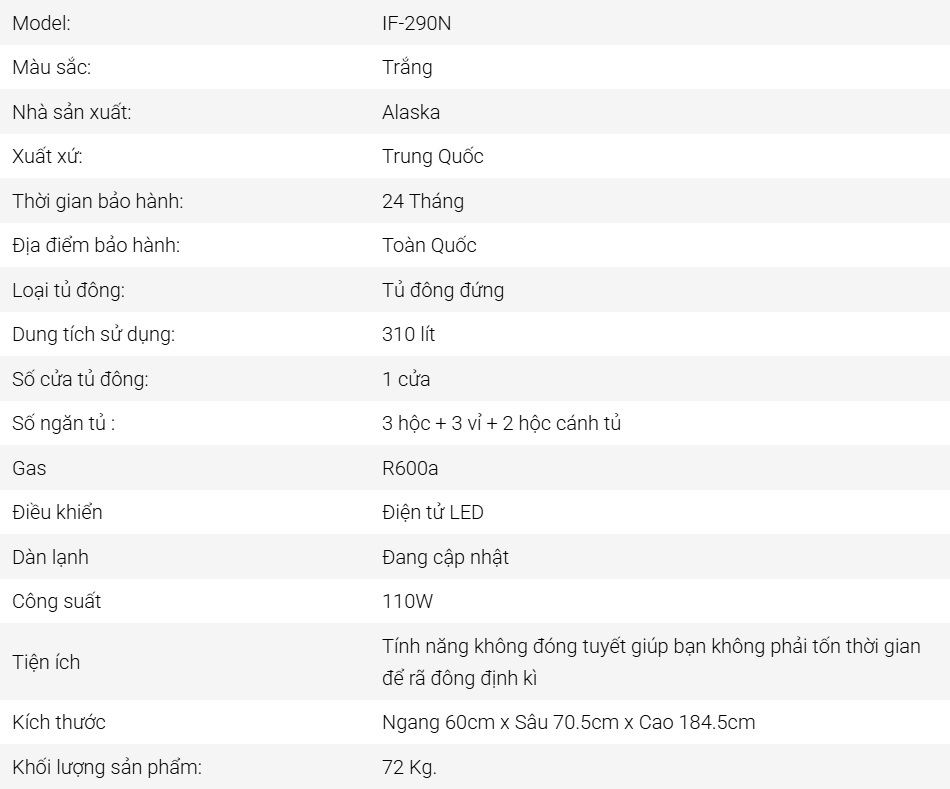 IF-290N là mẫu tủ đông Alaska có khả năng cấp đông thực phẩm nhanh mà không làm đóng tuyết. Tủ được ứng dụng công nghệ làm lạnh trực tiếp, hoạt động dựa trên nguyên lý đưa hơi lạnh trực tiếp tới ngăn tủ thông qua đối lưu gió để làm lạnh thực phẩm nhanh chóng trong thời gian ngắn.
