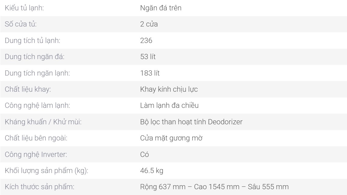 Dung tích tủ lạnh là 236 lít, trong đó dung tích ngăn đá là 53 lít và ngăn lạnh là 183 lít đáp ứng tốt nhu cầu sử dụng cho gia đình có từ 2 - 3 thành viên.