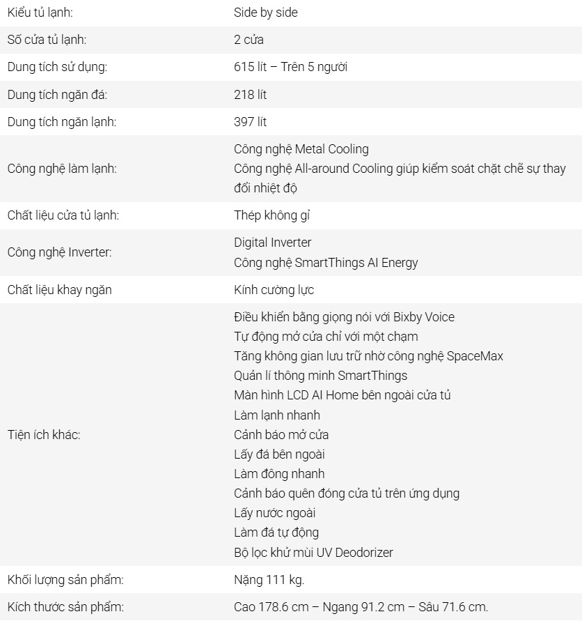 Tủ lạnh Samsung AI Home 615L Side By Side RS90F65D2FSV không chỉ sở hữu thiết kế đẹp mắt mà còn được trang bị hàng loạt công nghệ hiện đại, giúp bảo quản thực phẩm tối ưu, tiết kiệm điện năng và mang lại sự tiện lợi tối đa cho người dùng. Đây chắc chắn là lựa chọn lý tưởng cho những gia đình hiện đại mong muốn nâng cấp không gian bếp của mình.