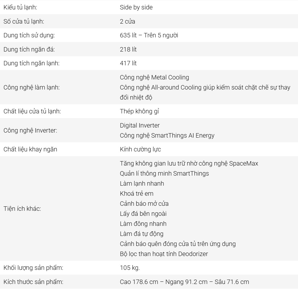 Với tổng dung tích sử dụng 635 lít, trong đó 417 lít cho ngăn mát và 218 lít cho ngăn đá, chiếc tủ lạnh này rất phù hợp cho các gia đình có trên 5 thành viên. Người dùng có thể dễ dàng bảo quản thực phẩm cả tuần hoặc các món ăn cho các dịp lễ, tiệc lớn mà không lo chật chỗ.